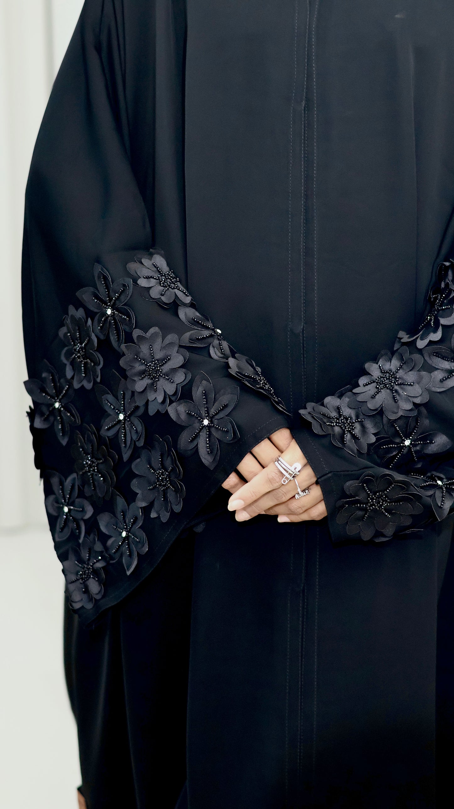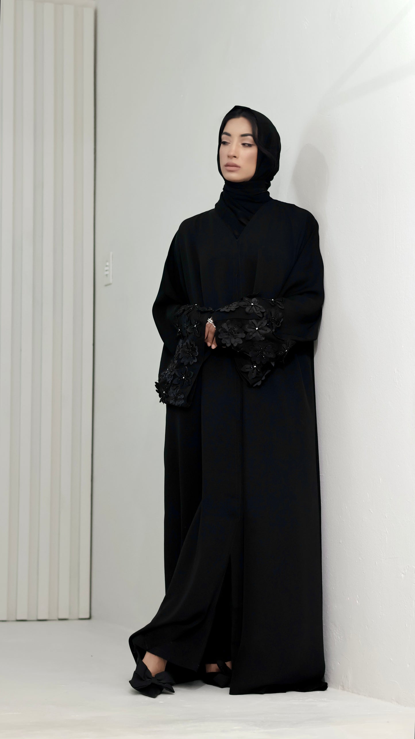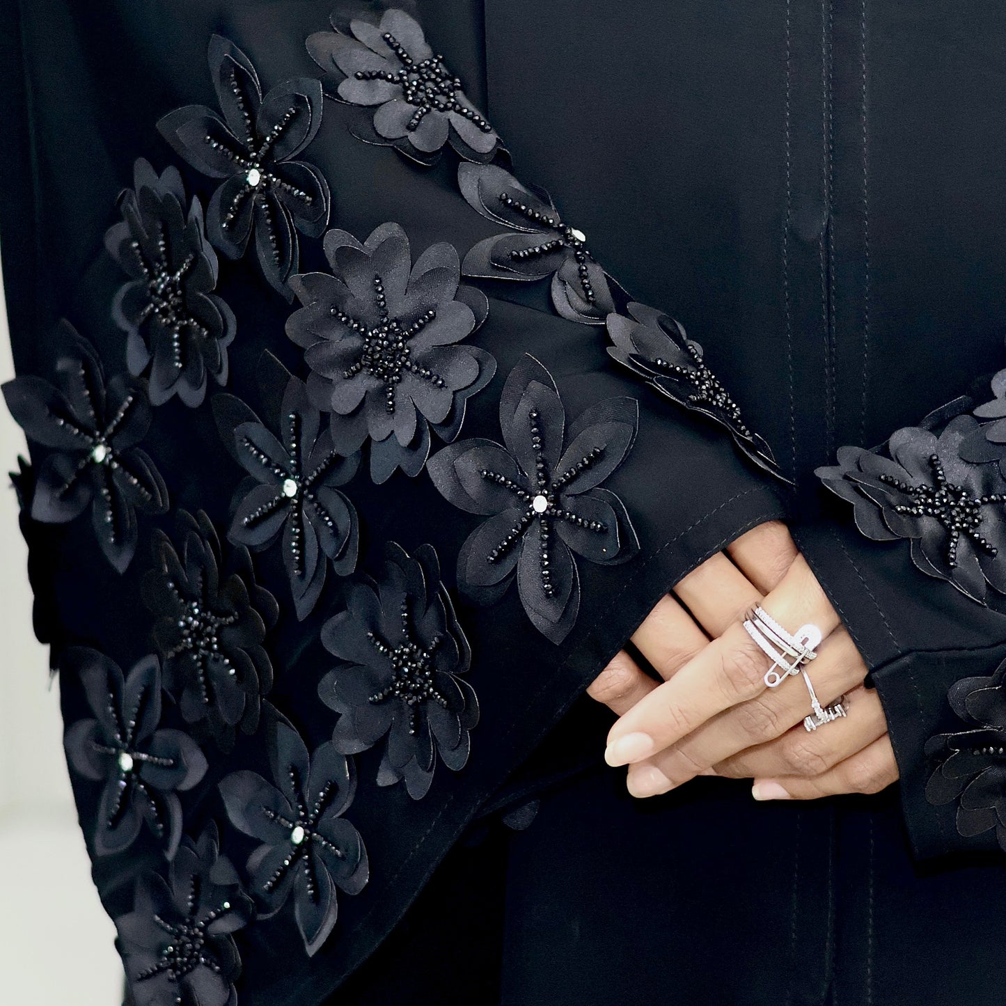 3D handmade flower detailing along the sleeves, crafted with ADAMMA’s signature cut and luxurious high-end fabric.