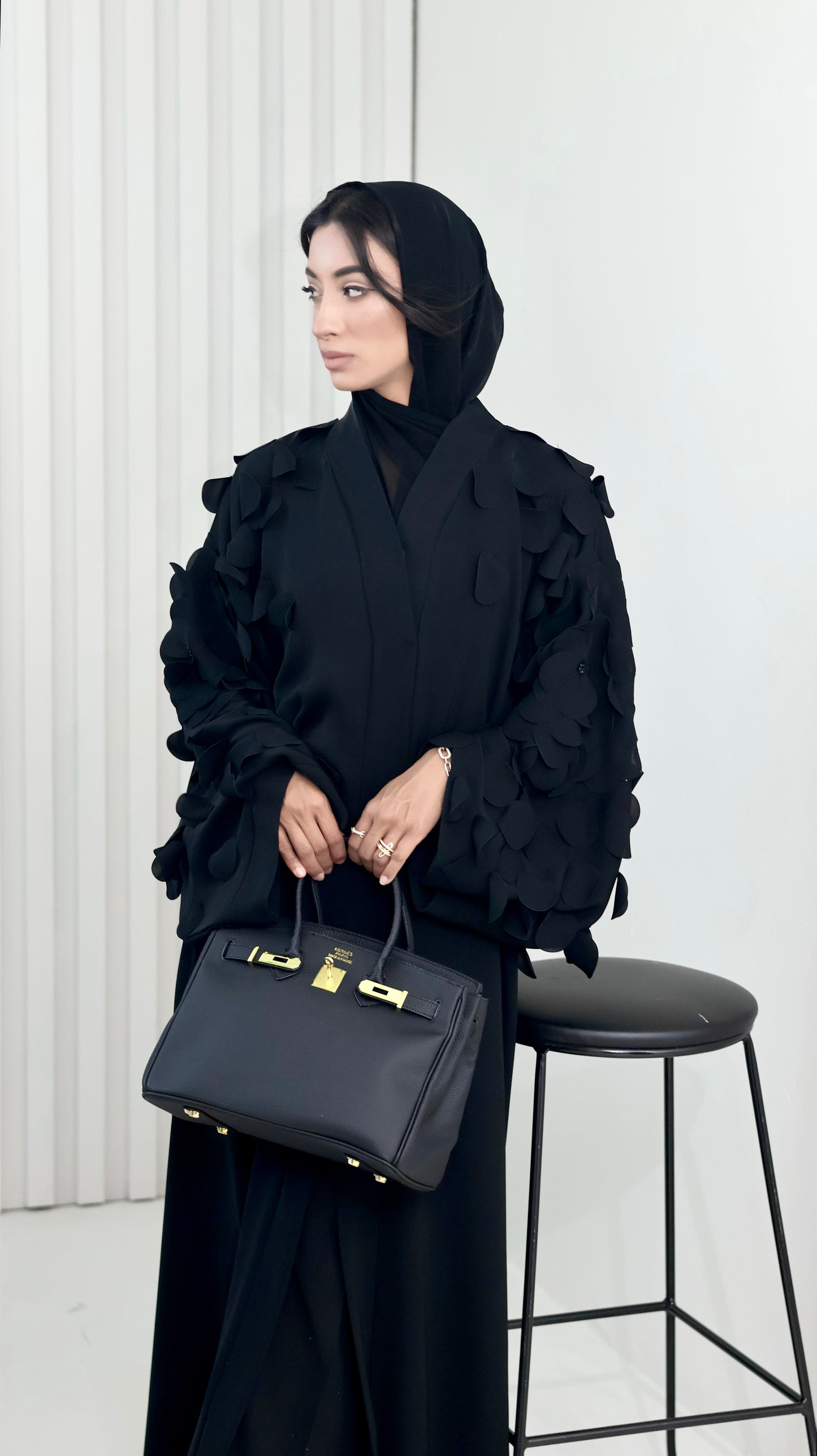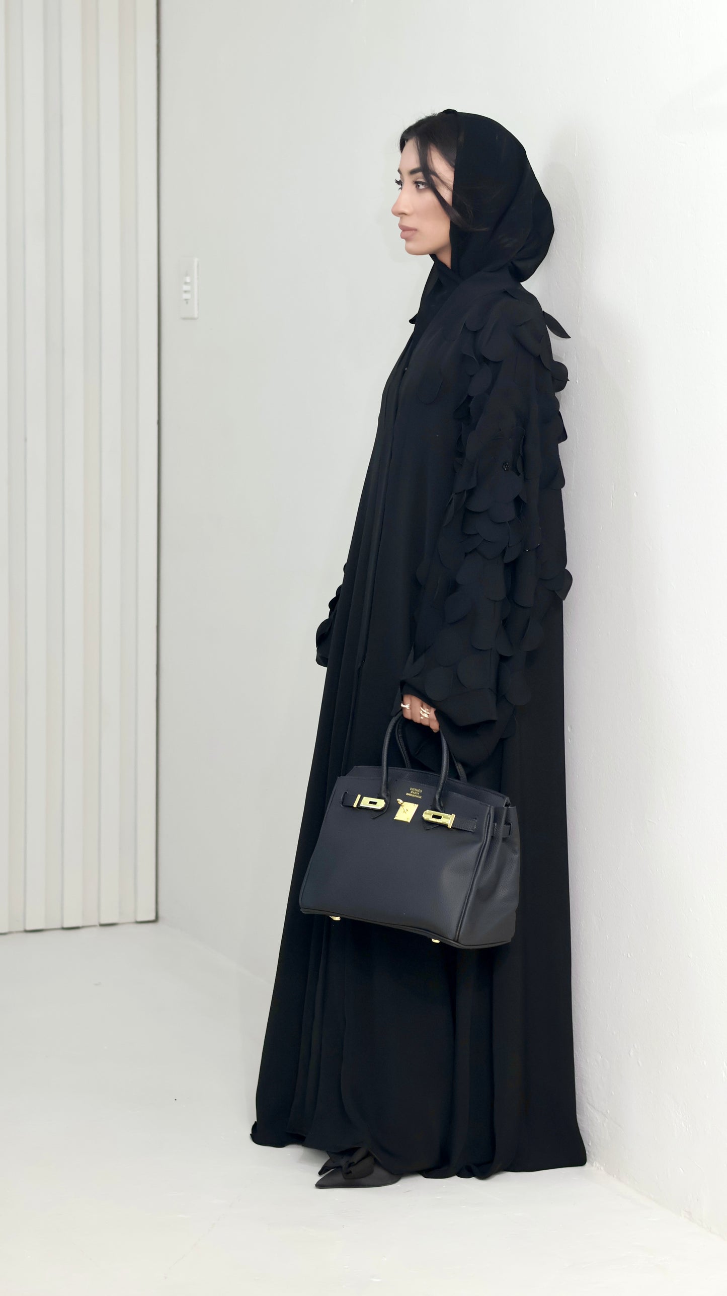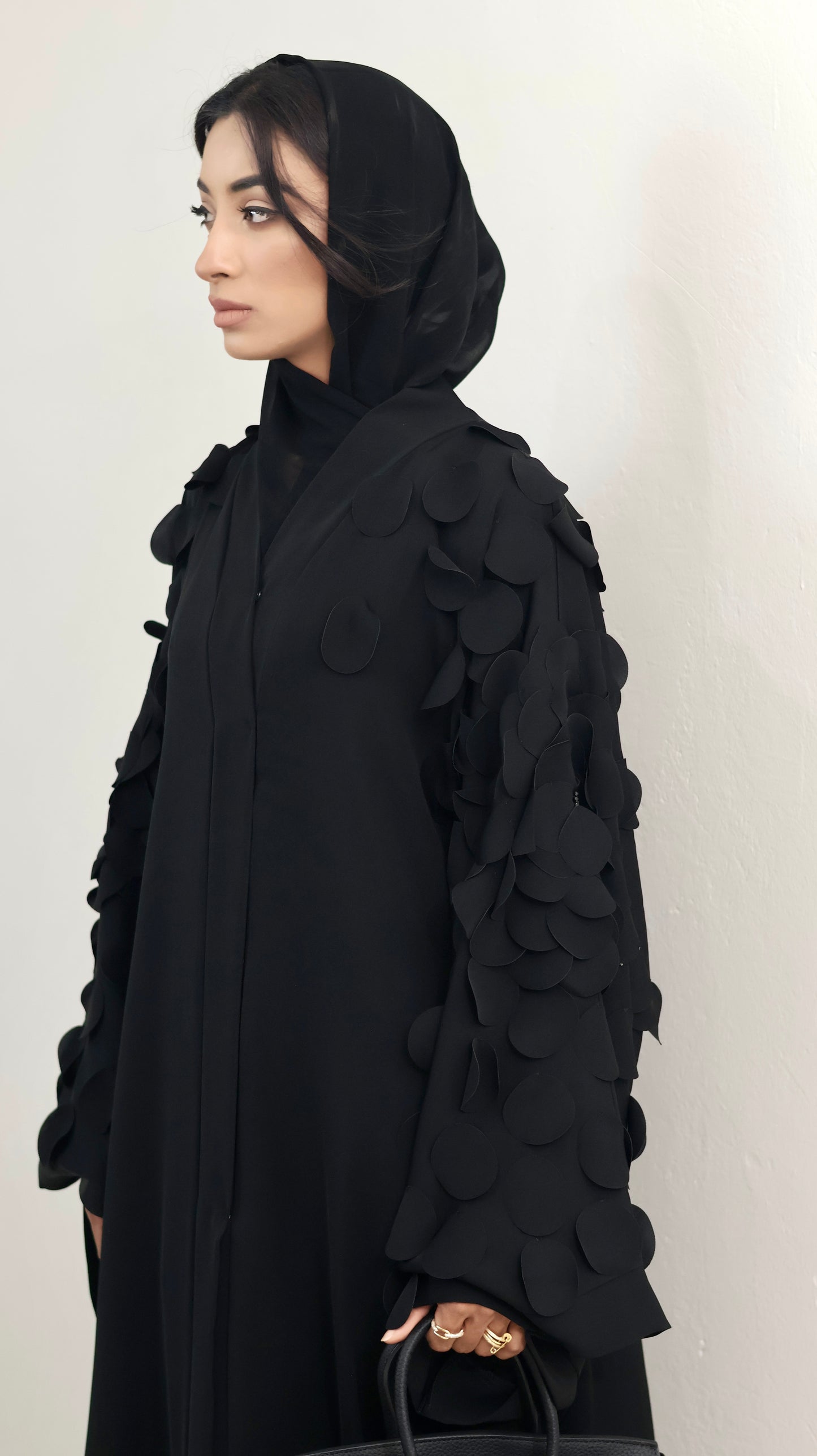Black nida abaya featuring shoulder laser-cut detailing, accented with a beautiful new silhouette